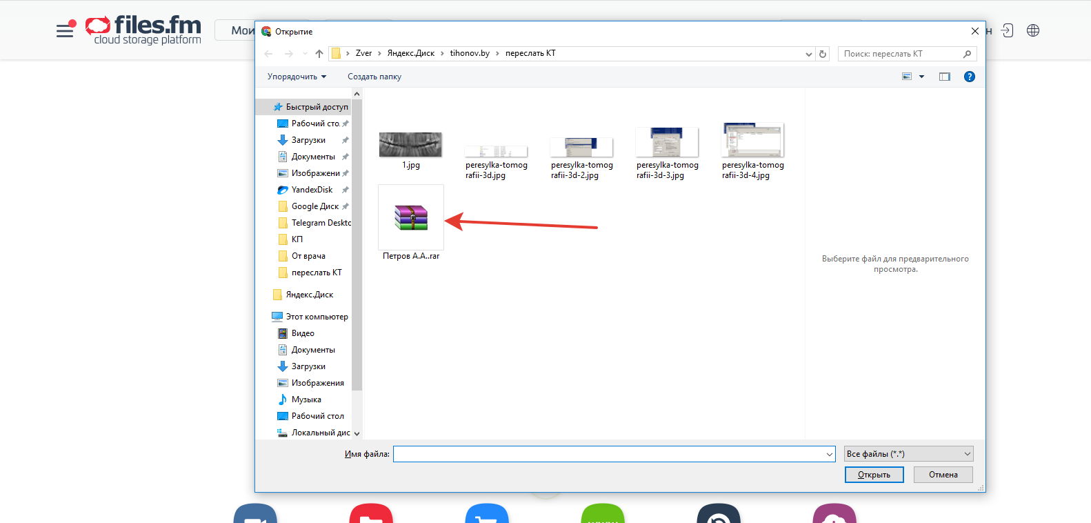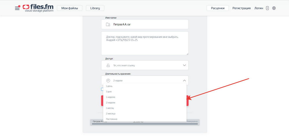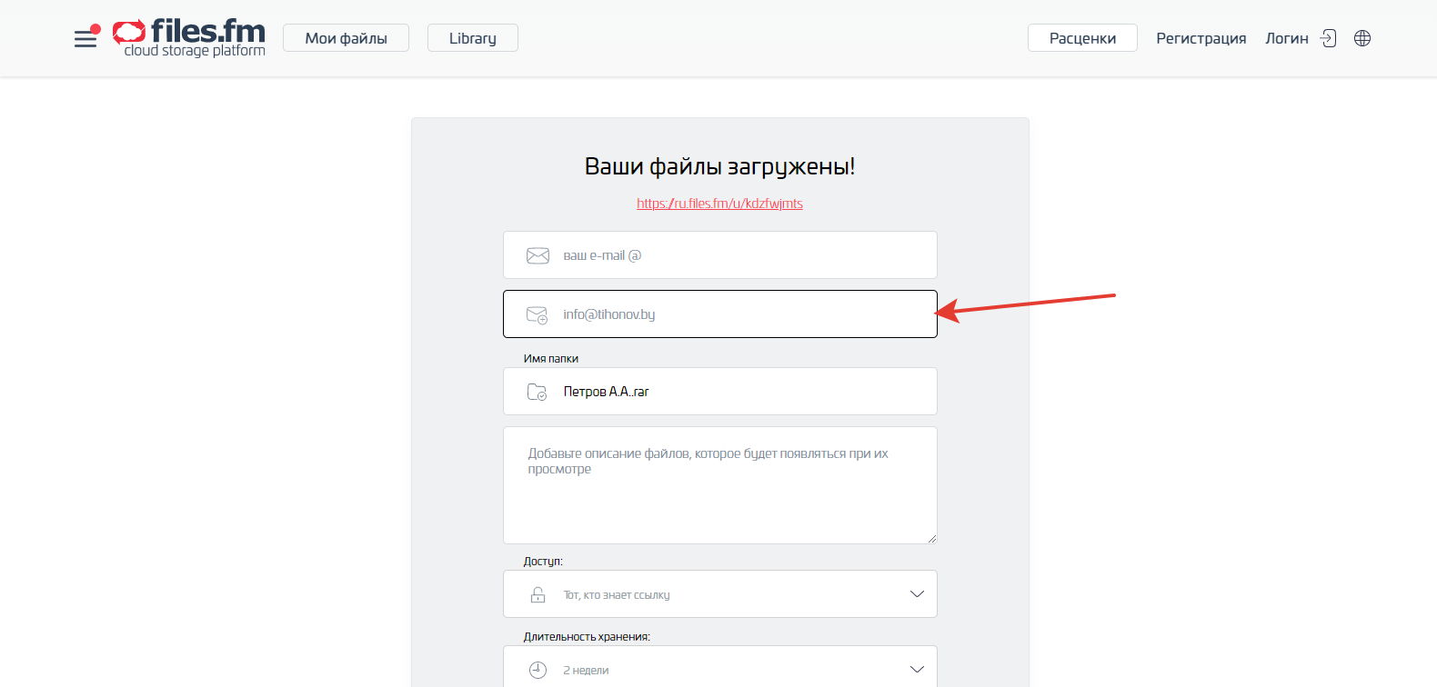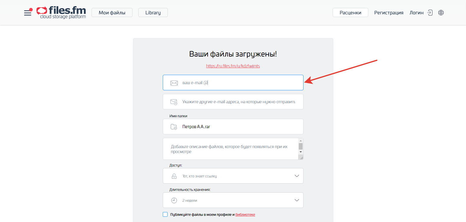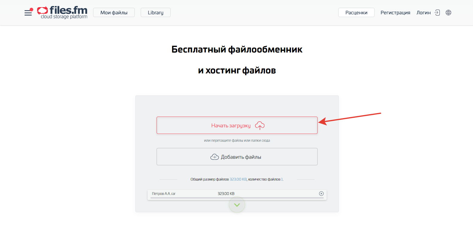 Затем в Интернете заходим на сайт для передачи файлов — https://ru.files.fm/