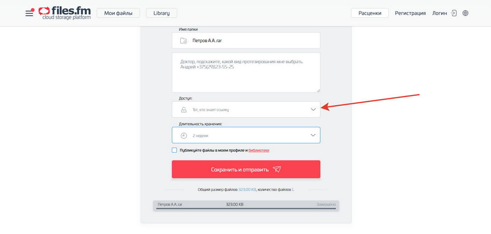 Всё, справлились. Нажимаете кнопку "Сохранить и отправить" и письмо с файлом прийдет ко мне на почту. В течение срока хранения файл также будет доступен по ссылке.