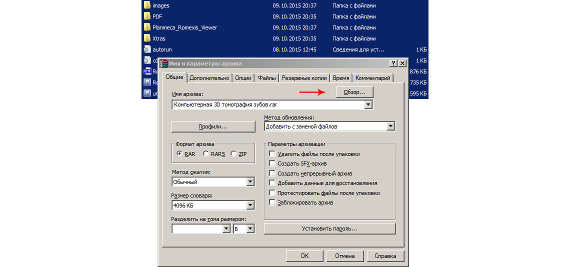 Во вновь появившемся окне «Имя и параметры архива» нажимаем кнопку Обзор. Это изображено на рисунке ниже: