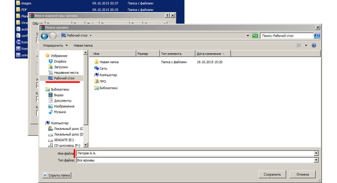 Затем в окне «Поиск архива» надо выбрать, куда сохранить архив. (К примеру, его можно сохранить на «Рабочий стол»). В нижней части открывшегося окна необходимо заполнить поле «Имя файла». Там мы печатаем Ф.И.О. (Петров А.А.) и нажимаем ОК. Файлы с КТ автоматически архивируются. Смотрите картинку ниже: