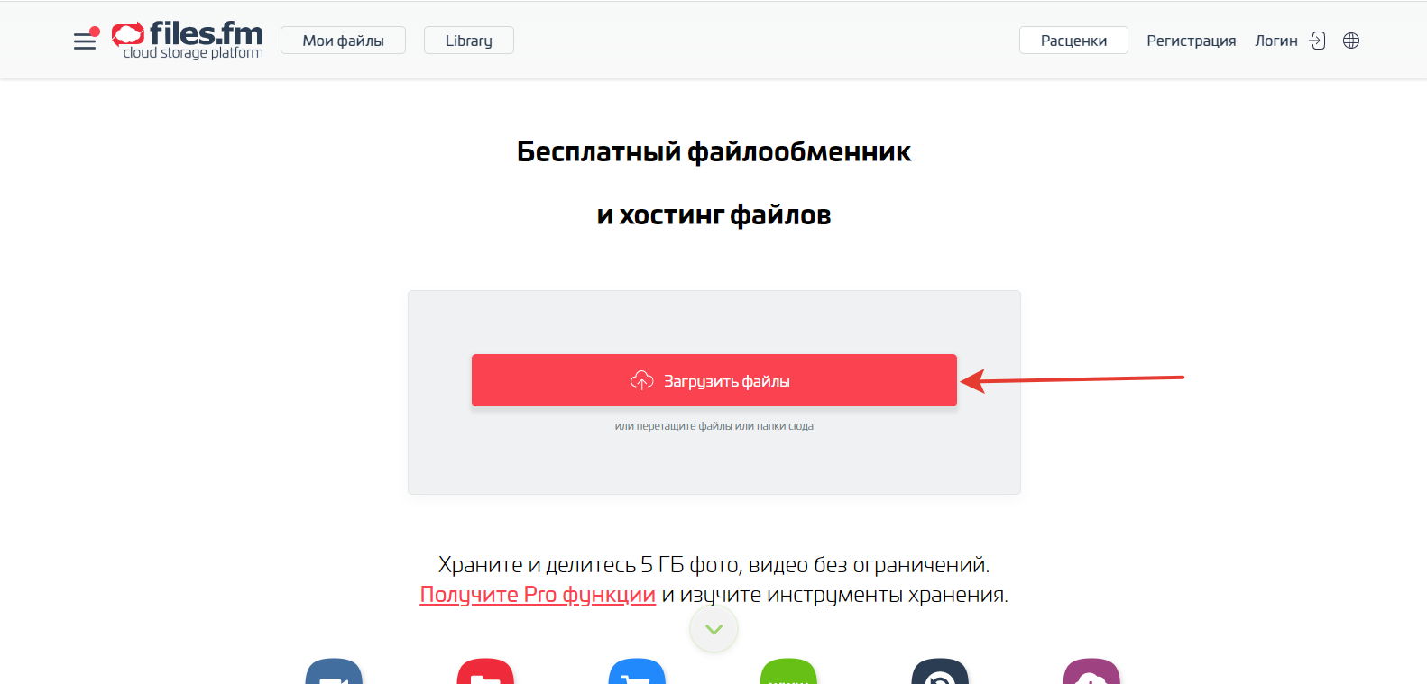 На главной странице нажимаем большую красную кнопку "Загрузить файлы"
