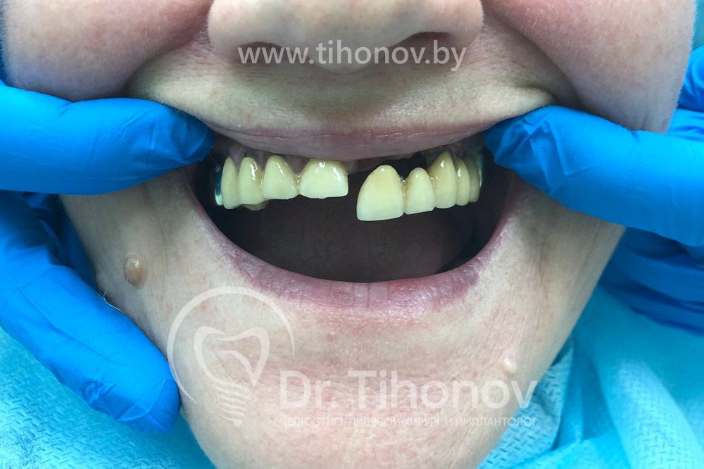 Пациентка обратилась с жалобами на оголение корней в области металлокерамических коронок, подвижность зубов верхней челюсти. Пациентка заострила внимание на том, что план лечения должен включать в себя возможность максимально быстро установить несъемный протез.