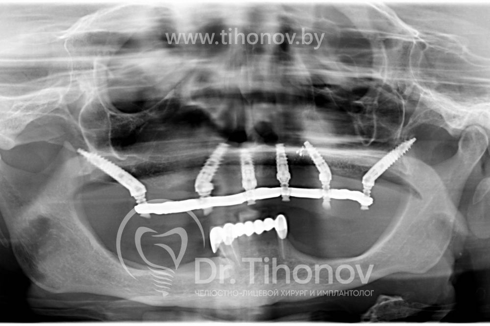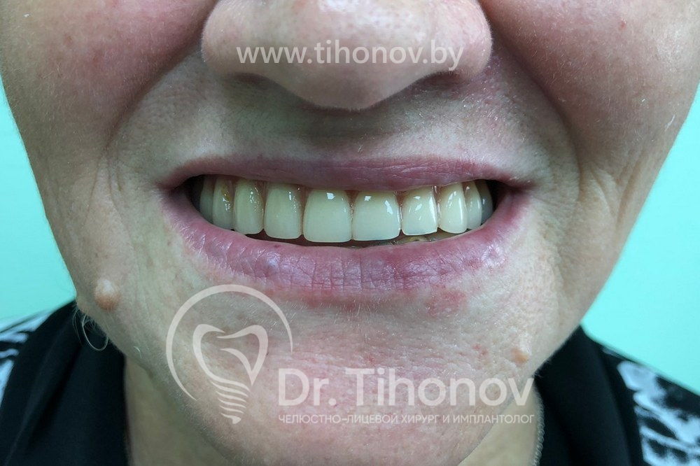 После изучения данных 3D-исследования челюстей и клинической ситуации в полости рта на очной консультации было принято решение о протезировании зубов на верхней челюсти при помощи методики All-on-6 (все на 6-ти). В день операции на верхней челюсти были удалены несостоятельные протезы и разрушенные корни зубов, установлены 6 имплантатов, в течение 4 дней был изготовлен и фиксирован несъемный металлопластмассовый эстетичный протез на верхнюю челюсть. Использование методики протезирования All-on-6 (все на 6-ти) в данном клиническом случае позволило полностью удовлетворить потребности пациентки.